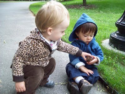 It was another Tuesday at the BBG (Brooklyn Botanic Garden). I've noticed that my son behaves differently when he is outside as opposed to being in the house. Inside, everything to him is old hat. He knows most every corner of the apartment. But outside, in nature, every little thing is fascinating to him. He could spend an hour examining a blade of grass. Take a look at him and his buddy Luka playing with some of mother nature's gifts, grass and sticks!
