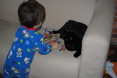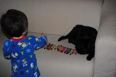 I'm used to starting out my mornings with tiny cars strewn all over the living room. However, the following activity was a first. Watch as Ari integrates Simon and Egreck into his vehicular plan.