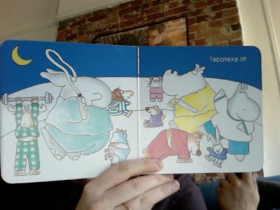 The animals are exercising before they go to bed, which is nonsensical. But it's cute and funny to see cartoon elephants, moose and other animals working out. I'll give Ms. Boynton a pass on that one.
