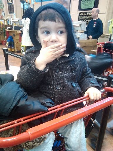 Ari got a free cookie, they were giving out samples, and at the checkout counter, he got stickers!
