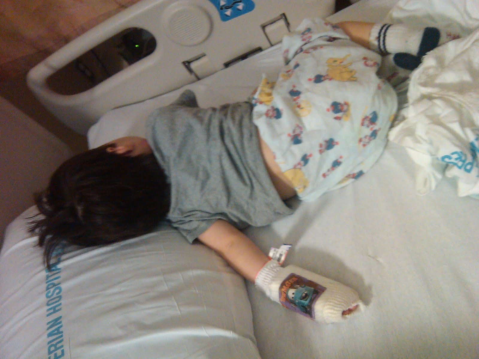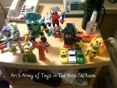 We left the office and headed to the Emergency Room. The pediatric Emergency Room was full of toys and DVDs. Ari was happy to curl up in bed and watch Disney's Robin Hood while he played with a pack of playing cards and a rubber duck that the nurse, Doug, gave him upon admission.