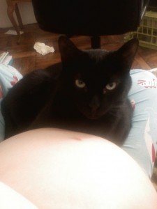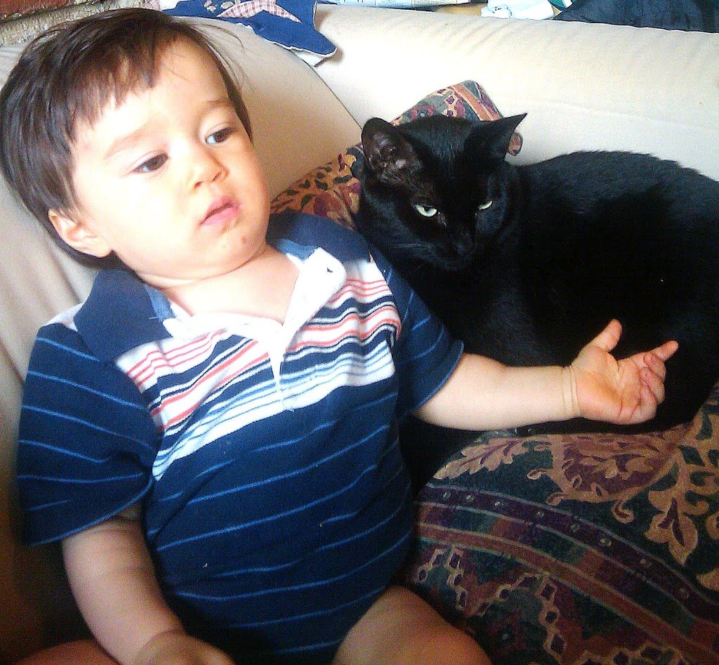 That blob of black fur next to my son is Egreck, my incredibly docile and friendly cat. He loves my son and my son loves him. In fact, Egreck has always been curious about babies. When I was pregnant he did not know what to make of my enormous round belly.