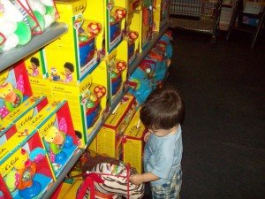 He seemed perplexed and slightly frustrated by the many toys in boxes. It was like the possibility of toys without actually being able to play with them.