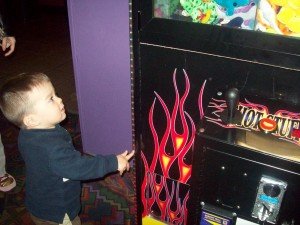 When we exited the theater he became fascinated by the individual lights attached to the game machines in the lobby. He pointed the lights out to Mint.