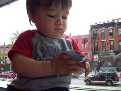 After I successfully got my son into the stroller (which was a feat in itself since he wants to walk everywhere) we set out for the 9th Street YMCA in Park Slope. When we got there there was a long line of people waiting to register for classes. During the wait my son entertained himself at the photo ID area.