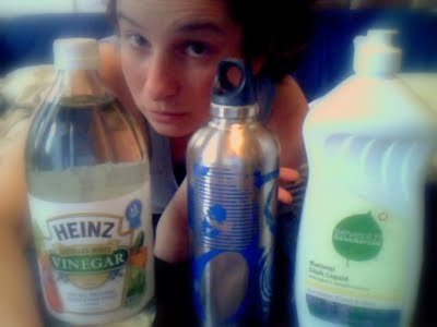 "Use a drop of dish washing liquid and a little bit of vinegar. Dilute this solution with water. Let your bottle sit overnight. This will sterilize your bottle. Then rinse it out completely in the morning."