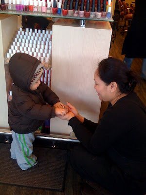 When I left the nail salon, I began to wonder if it was a cultural thing. I asked the ladies where they were from, they said "Nepal." I know nothing about the culture of Nepal. Perhaps Nepalese culture values children more than American culture does? If anyone knows, please fill me in.All I know is that if I were to go into a posh New York City grooming establishment and my son flipped out I don't think the employees there would be so forgiving.
