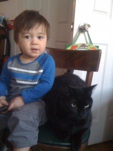 Ari shows his love for the “keys” (Ari’s word for kitty) by lying on top of them and kissing them. I try to monitor his affections toward his feline uncles (they are his family after all) because he can overwhelm the “keys.”