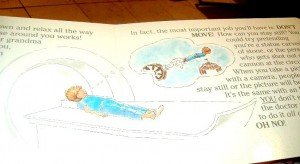 I was truly baffled by this book. I wanted to laugh and cry at the same time. I mean, it was really strange that someone actually took the time to make a children’s book about MRIs. And it is also sad that there is a need for a children’s book about MRIs. It means that kids are actually getting MRIs.