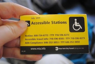 We managed to get out the door, and onto the subway. We were late, as usual, so I frantically asked the subway booth person which was the closest handicapped accessible station to my destination. I did not want to carry my stroller up several flights of stairs. She kindly handed me this: