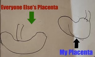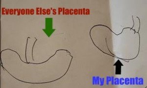 Essentially, what it means is this: the umbilical cord is supposed to connect to the center of the placenta. Mine connects on the side of the placenta, like a tennis racket (not the analogy I choose to use, I am merely quoting ultrasound tech Susan). Here is a diagram to further confuse you: