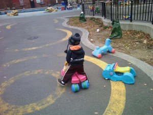 She suggested that I might take Ari to the playground attached to the Public School across the street. So we zoomed across the street. At the time the school was having a fire drill. I asked the Assistant Principal if it would be okay to use their playground after the fire drill was over. She said it wasn’t open to the general public during school hours; fair enough.