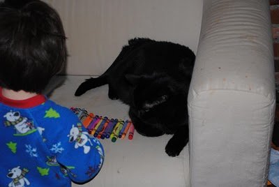 I'm used to starting out my mornings with tiny cars strewn all over the living room. However, the following activity was a first. Watch as Ari integrates Simon and Egreck into his vehicular plan.
