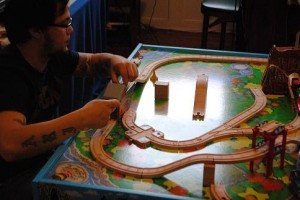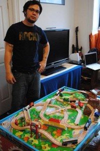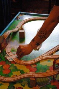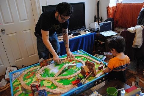 Finally, he agreed to switch places with us. We went upstairs to watch the kids while he took the boxes upstairs. Once he realized what I got for Ari, he began to get excited. In fact, after he assembled the table itself, he ran back to the toy store, got Ari a complete train track set to go with the table, and set it all up! The process took hours, but it was worth it.