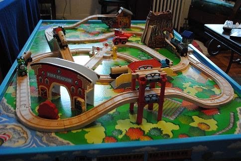After she held Samara and hung out with Ari, we decided to go out for a walk, get our eyebrows waxed, and stop in a local toy store to pick up a Thomas Train for Ari. Once we set foot in the store, however, my original plan to purchase one train went out the window. You see, in this particular toy store they have a wooden Thomas train table with an elaborate set up featuring up hill bridges and multiple loop-de-loops.