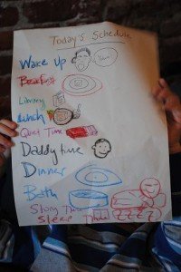 As much as my first born would like to deny it, he loves routine. With the addition of his little sister to our family, any semblance of routine we once had has gone completely out the window. My brilliant friend, and early childhood educator, Ubaldina (Ubie for short) suggested creating a daily schedule for Ari. That way he’d know what to expect next at any given point during the day. I took out my writing utensils and got to work. Ari seemed pleased with the final product.