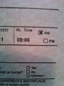 When we first received Samara’s birth certificate there was error on it. So, like any neurotic Jewish mother would do, I trekked down to the hospital with the two kids to get the error fixed. The error, in case you were interested, was that the time of birth was listed as 10:07 am, when Samara was actually born at 8:06 pm.