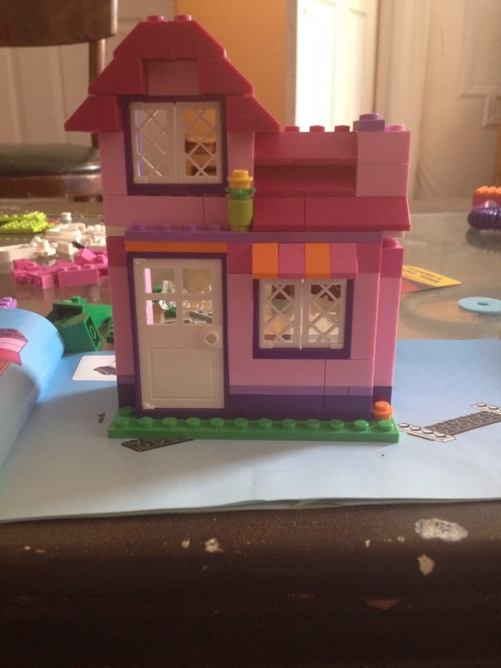 I never knew I had these fine motor skills. I could have been an engineer. My daughter was impressed at the house coming together. She said “wow,” as the plastic orange and pink alternating awning shingles were put into place.