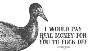 I was complaining about inspirational quotes on Twitter and one of my Twitter buddies said something to the effect of “I hate inspirational quotes, I look at EffinBirds instead.” Well, it took me three seconds to look at their account and I was hooked. There are pictures of elegant birds saying “fuck” in various contexts. The birds say shit like “I know what will solve this problem, more fucking meetings.”
