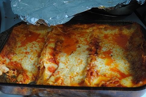 I started to panic. I ran down the hall and into the kitchen. I hastily removed the foil on top of the lasagna pan and found this: